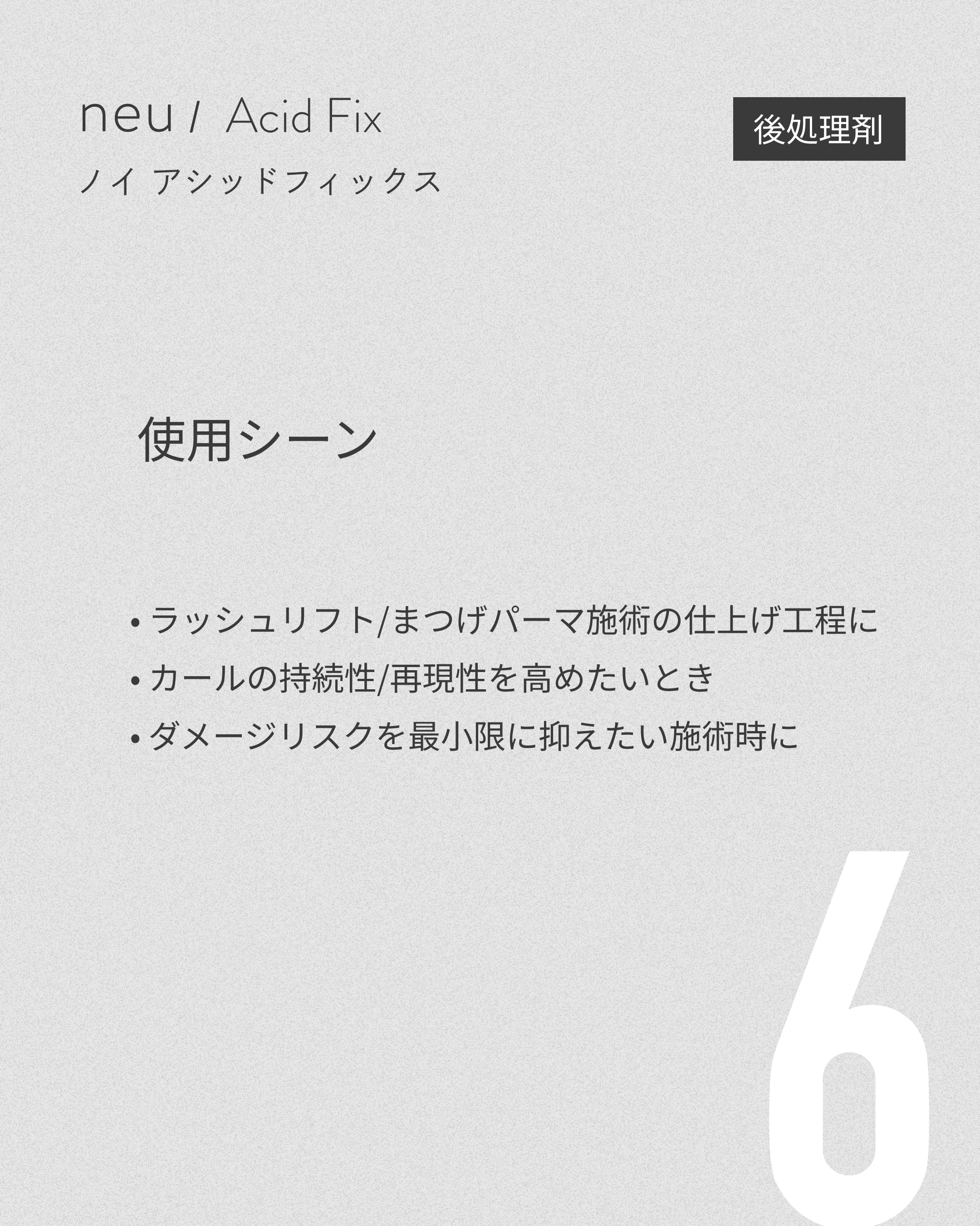 ノイ アシッドフィックスは、まつげパーマ・ラッシュリフト施術の仕上げ工程で欠かせない後処理剤です。