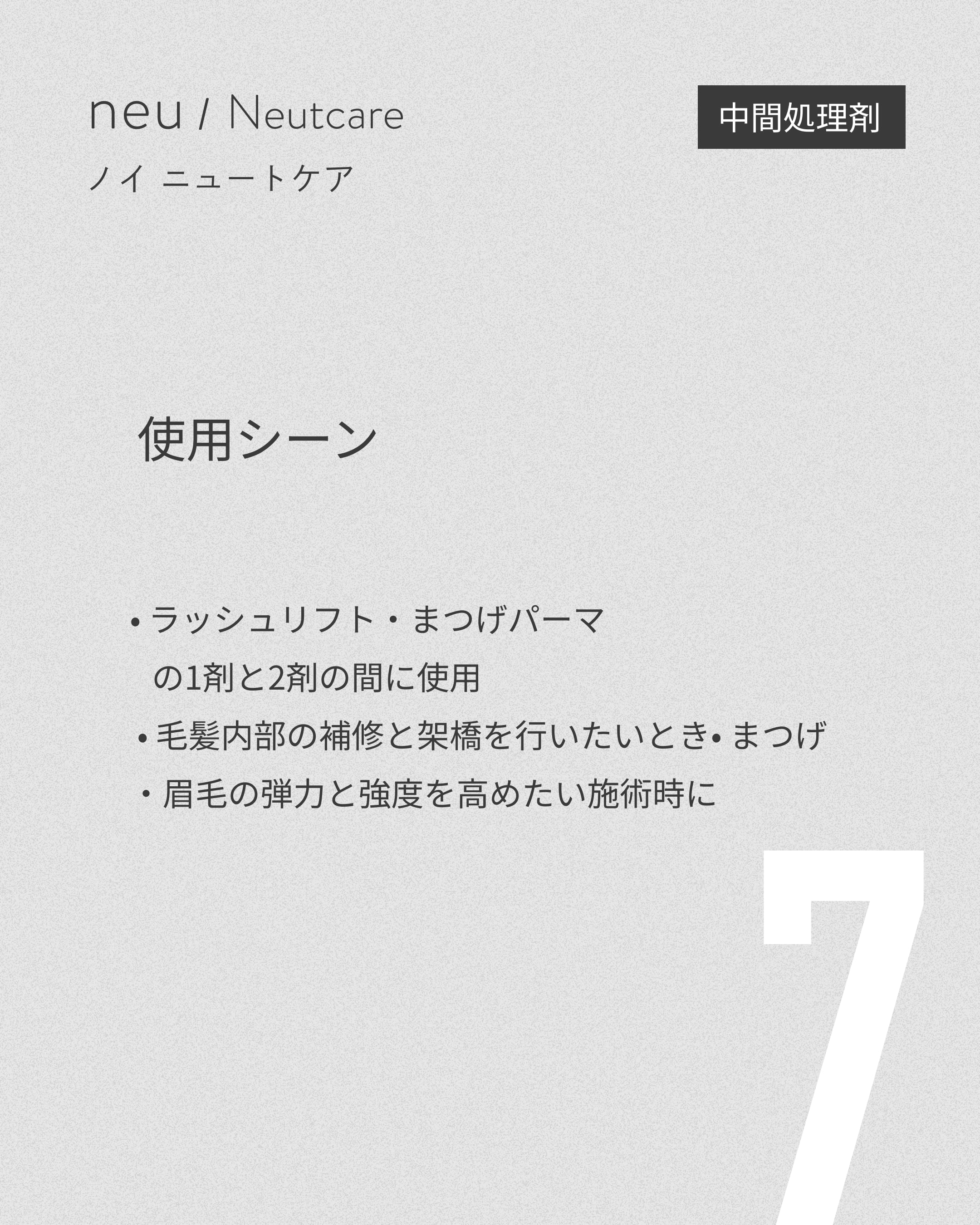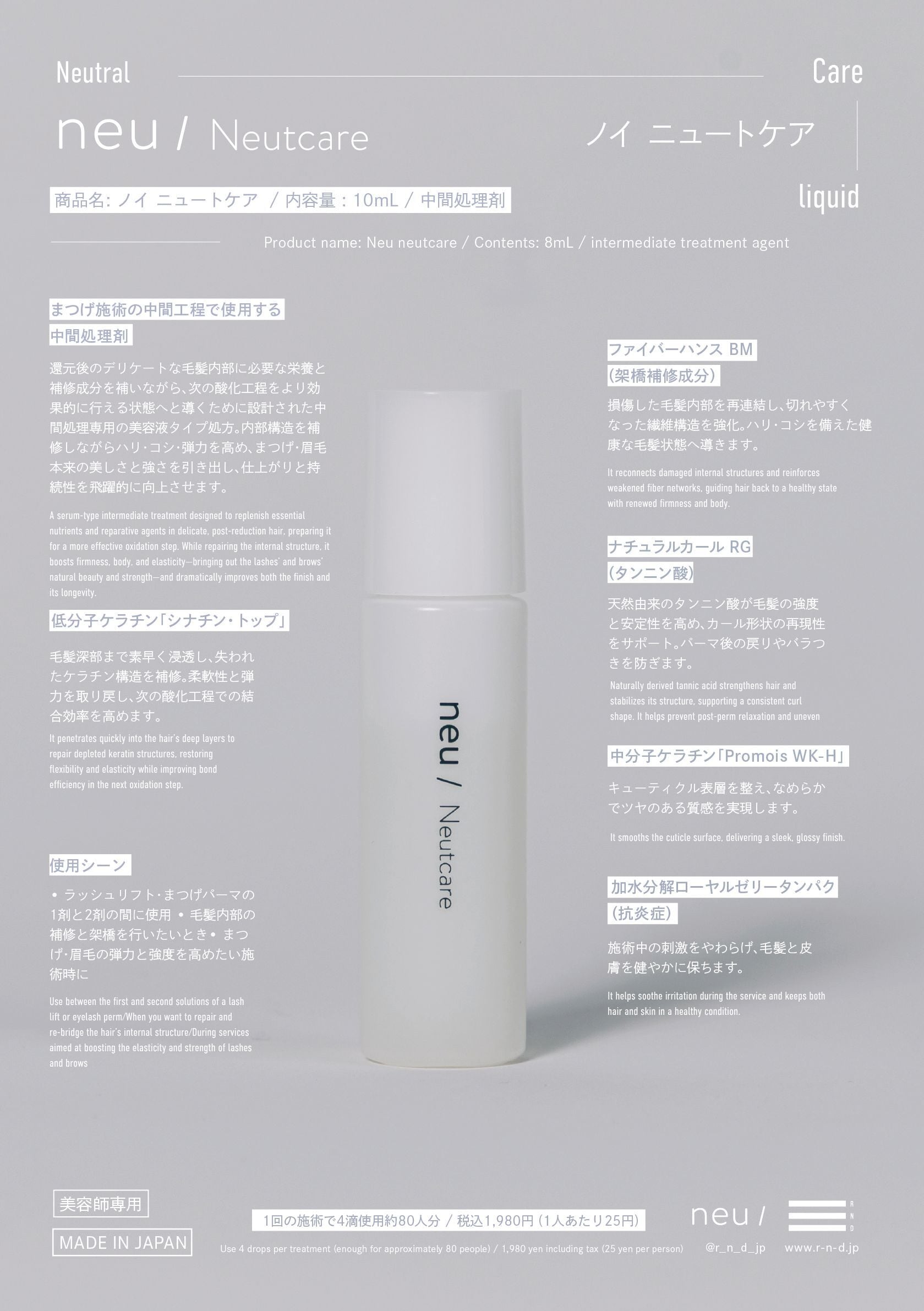 ノイ ニュートケアは、還元後のデリケートな毛髪内部に必要な栄養と補修成分を補いながら、次の酸化工程をより効果的に行える状態へと導くために設計された中間処理専用の美容液タイプ処方です。